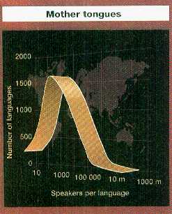New Scientist on 12 August ran a piece “Lost for Words” by Jonathan Knight. It focused on the plight of Navajo: with 150,000 speakers yet considered endangered because of its pattern of use, and the skewed age-range of its speakers. The article took a fairly detached and analytical view, looking at the statistics of language populations (see figure, just above), before quoting some general remarks by Mark Pagel, Nicholas Ostler, Doug Whalen, and especially Salikoko Mufwene of the University of Chicago, all trying to give a clearer picture of the link between survival of a language and maintenance of a culture. Canada’s CBC broadcast on 8 October a programme entitled “Tlingit Teacher Passes On Language, Culture” about the retiring Lucy Wren, of Carcross, Yukon. It can be found in text and audio here Most recently, on 21 October 2000, The New York Times published an article which is so informative it is reprinted below in the Where to Go, in the World and On the Web section of this Ogmios. A little earlier, on 30 September 2000, The New York Times had considered the con’s and pro’s of making an attempt at language revitalization in an article named “Speak, Cultural Memory: A Dead-Language Debate”. Michael Blake, a professor of philosophy at Harvard University, who recently published a broadside attack on the movement to protect endangered cultures in Civilization magazine, was ranged against: Jessie Little Doe Fermino, a member of the Mashpee tribe on Cape Cod, who has been on a single-minded mission to revive the language of her ancestors, Wampanoag; Daryl Baldwin (already mentioned), who is reviving the language of the Miami Nation in Indiana and raising his children in it; Akira Yamamoto, a professor of linguistics at the University of Kansas who works each summer at the University of Arizona's indigenous language development institute; Diane Ravitch, a professor of education at New York University, apparently a frequent critic of progressive educational fads, but a strong defender of language revival. Faced with a half-hearted claim that communities choose to give up their languiages in the interest of progress, the article goeson to quote the case of Hawa’ii, where outsiders simply moved in and deprived the islanders of their traditions, their independence and their language. A somewhat unequal debate, some may think, but the fact is that there is rather less to be said anti than pro. As Winston Churchill famously said, the difficulties argue themselves. Once people realize that widespread bilingualism is not only possible, but also - if anything - beneficial to the speakers, there is very little left to say on whether language survival is desirable. To quote Michael Krauss (in Newsweek): “If you see an ancient pagoda, you’re not immediately tempted to bulldoze it; and languages are intellectual pagodas.” As for feasibility, L. Frank Manriquez, a worker for Tongva, spoken in the Los Angeles area, put it well (in the Whole Earth section, above). Coming away from a conference of indigenous language activists, she said: “How can it be hopeless, when there is so much hope?” | |