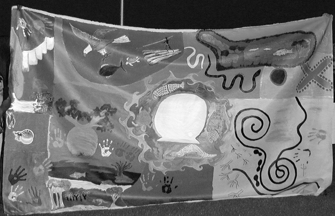 Picture painted for FEL by the many Aboriginal people at FEL VII; each section was painted by a different language group. | ||