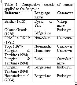 References 2005 field surveys Linguistic materials on: Ampari Pa, Ana, Bangime, Bunoge, Dogul Dom, Ampari Kema, Nyambeenge, Tebul Ure, Tommo So Pirő, Walo, Yanda. Four languages, Ana, Bunoge, Tebul Ure and Walo were recorded for the first time. A previously undocumented sign language was discovered among the Tebul people and a video record of sample sentences and narratives in sign language, Tebul Ure and French was made. All these languages have only a small number of speakers and reports on the endangerment status of individual languages will appear in future issues of Ogmios. Ba?gi me, a language of unknown affiliation in Northern Mali Roger Blench, Mallam Dendo, Cambridge Language isolates are extremely rare in the world, and those in Eurasia, such as Basque and Burushaski, have received their fair share of scholarly attention. However, the few African isolates, Hadza, Laal, Jalaa are much less well known, which is surprising, given their overall importance in understanding the linguistic history of the continent. Another likely isolate is spoken among the Dogon language cluster in northern Mali. An annotated wordlist of the Ba?gi me language was collected with the assistance of Kabo Bamani from a group of villagers in Niana on the 2nd and 9th of March 2005. The informants were Yamba Babaji, Kunja Kasambara, Baba Tarawali. Ali Babbaji, Kola Basogo and Samba Babbaji, who all appear in this picture. ![]() I would like to thank them for their patience as the elicitation sessions were long. This language has quite a number of alternative names, given the small quantity of published research on the language. These are (Table 1);