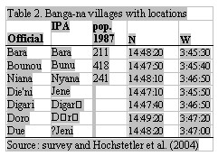 ![]() The terms ‘Numadaw’ and similar were completely unknown. This survey found the language name to be Ba?gi-me and the name of the people to be Ba?ga-na. The intrusive –ri- is found in many records of endonyms in this area (e.g. Duleri for the neighbouring DulŤ Dogon and probably derives from Fulfulde. Location and settlements Ba?gi-me is spoken in seven villages east of Karge and reached by turning off the Sevaré-Douentza road 38 km. north of Sevaré. Table 2 shows the names of these villages with map locations.