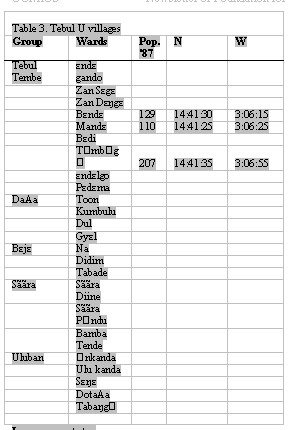 General Calame-Griaule (1956:67) says, "This dialect (called ‘Tew Tegu’ en Dyamsay and ‘Bede So’ in Toro) is spoken in the villages of Upper Bamba. (Those of Lower Bamba speak Dyamsay Bama Tegu)." Hochstetler et al. (2004) say ‘Oru yille is spoken in three tiny villages of Bamba du Haut. In addition to the xenonyms mentioned in Calame-Griaule (1956), Yanda-dom speakers call it ‘Tebl.’’ They give the population from the 1987 census as 400. This seems surprisingly inaccurate; the Tebul U live in twenty villages plus the recently-founded Dasalam [=Dar es Salaam]. The villages are mostly in the hill areas above Bamba and are often no more than hamlets. There are probably 3-4000 speakers. Table 3 shows the villages recorded by the survey and the locations of three that are listed in the 1987 census. The villages are so sub-classified. ![]() The Tebul Ure language is presently being transmitted to the children. The second language of Tebul Ure speakers is Jamsay Tegu (another Dogon language) and many also know Yanda. Fulfulde, a dominant language in the zone, is not very well known and there is a limited amount of French spoken, usually by migrant workers or students. However, the nearby village of Bamba has recently been added to the Dogon Plateau hiking trail, and the isolation of the Tebul U villages will shortly end, with the usual outcome for the language. Nothing is known of Tebul U history, but today all villages are strongly Islamised. In addition to the spoken language, a sign language exists in Uluban and related hamlets, which is used to communicate with a small number of deaf individuals. Almost all the inhabitants seem to have some fluency in this sign language and videos were made of a number of narratives with ‘translation’ into Tebul Ure and French.