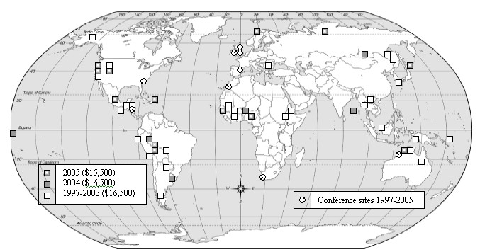 We have had an excellent year financially, which has put us in a position for the first time to do something approaching justice to the range of excellent grant applications which come to us every year. This year we were able to fund one proposal out of every four, awarding US$15,500 in all, almost as much money as we distributed in the all the first six years of our grants programme. The map shows where these grants have been directed, this year and in all the years before, and it is clear that our influence, light though it is, is being felt in many of the most inaccessible parts of the world.